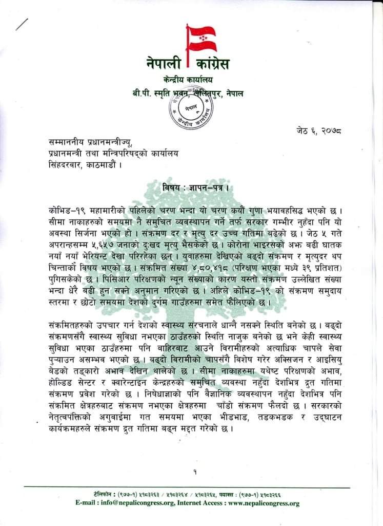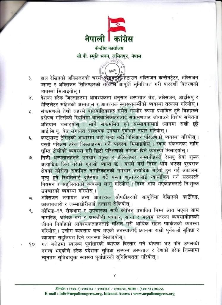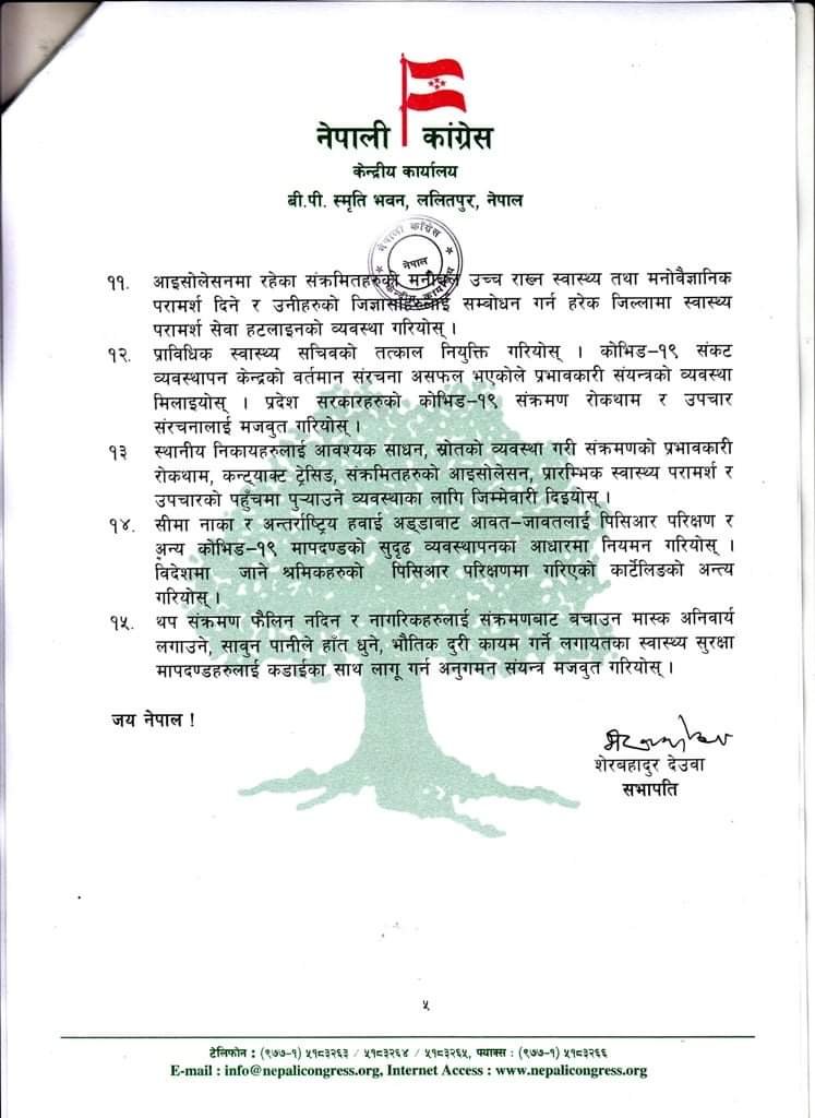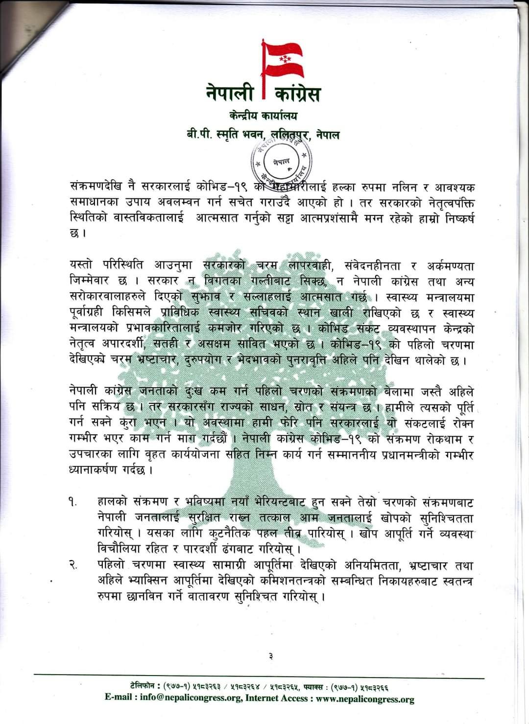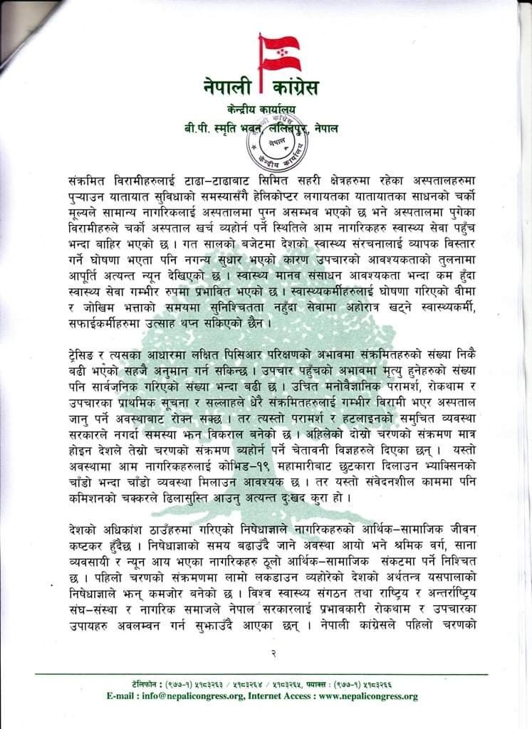 नेपाली कांग्रेस जनताको दुःख कम गर्न पहिलो चरणको संक्रमणको बेलामा जस्तै अहिले पनि सक्रिय छ । तर सरकारसँग राज्यको साधन, स्रोत र संयन्त्र छ । हामीले त्यसको पूर्ति गर्न सक्ने कुरा भएन । यो अवस्थामा हामी फेरि पनि सरकारलाई यो संकटलाई रोक्न गम्भीर भएर काम गर्न माग गर्दछौं । नेपाली कांग्रेस कोभिड—१९ को संक्रमण रोकथाम र उपचारका लागि वृहत कार्ययोजना सहित निम्न कार्य गर्न सम्माननीय प्रधानमन्त्रीको गम्भीर ध्यानाकर्षण गर्दछ ।