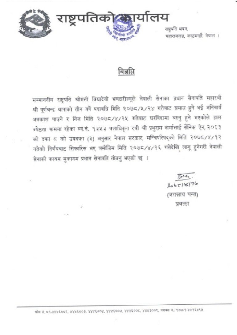 गत साउन १२ गते बसेको मन्त्रिपरिषदको बैठकले बालाधिकृत रथी प्रभुराम शर्मालाई कायम मुकायम प्रधानसेनापतिमा नियुक्त गर्नको लागि राष्ट्रपति समक्ष सिफारिस गरेको थियो । सोही मन्त्रिपरिषदको सिफारिस बमोजिम आगामी साउन २६ गतेदेखि लागू हुने गरी शर्मालाई कायम मुकायम प्रधानसेनापतिमा नियुक्त गरिएको राष्ट्रपति कार्यालयले जनाएको छ ।