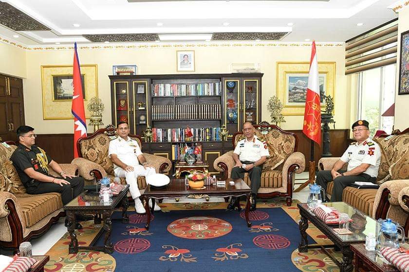 काठमाडौं । नेपाल भ्रमणमा रहेको भारतको नेसनल डिफेन्स कोर्स–२०२१ को भ्रमण दलले मंगलबार नेपाली सेनाको जङ्गी अड्डामा भ्रमण गरेको छ । जङ्गी अड्डामा आयोजित एक कार्यक्रमकाबीच प्रधान सेनापति महारथी प्रभुराम शर्माले उक्त भ्रमण दलका प्रमुख तथा रियर एडमिरल धिरेन भिगसँग आफ्नो कार्यकक्षमा शिष्टाचार भेटवार्ता गरेका थिए ।