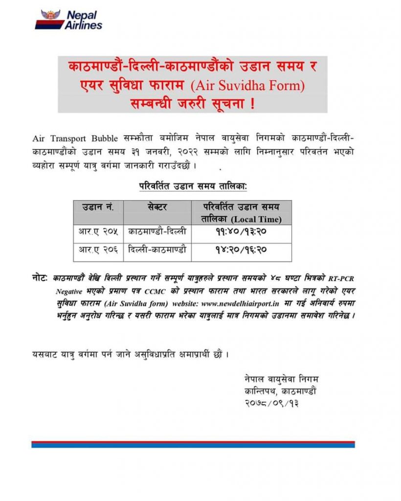 यस्तो फारम नयाँ दिल्ली विमानस्थलको वेवसाइटमा राखिएको छ । यसरी फारम भर्ने यात्रुले मात्र उडानको मौका पाउने नेपाल एयरलाइन्सले जनाएको छ । निगमले उडान तालिकामा समेत परिवर्तन भएको जनाएको छ । अब नेपाल एयरलाइन्सको जहाज दिल्लीका लागि हरेक दिन दिउँसो ११ः४० मा दिल्ली उड्ने छ ।
