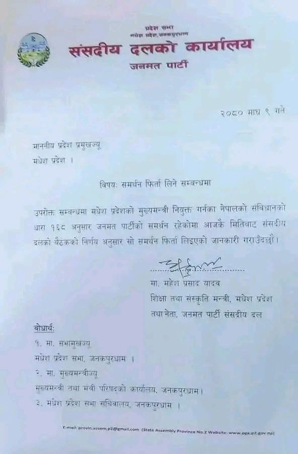 काठमाडौं । जनमत पार्टी मधेश प्रदेश सरकारबाट बाहिरिएको छ । आज (मंगलबार) मधेशका मुख्यमन्त्री सरोज यादवलाई दिएको समर्थन फिर्ता लिँदै जनमत सरबारबाट बाहिरिएको हो ।